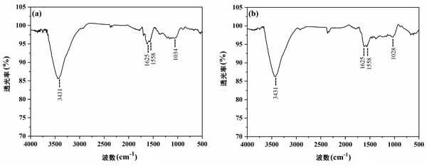 圖2:(a)活性炭1和(b)活性炭2的FTIR振動(dòng)光譜。