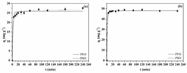 研究了初始吸附物濃度為50mgL-1和pH4的兩種活性炭的亮藍(lán)染料染料吸附動(dòng)力學(xué)行為。作為時(shí)間函數(shù)的吸附容量曲線分別如圖3a、b所示,分別為活性炭1和2?梢杂^察到活性炭2獲得的曲線的特征在于更快的吸附速率。活性炭2在大約10分鐘內(nèi)達(dá)到平衡。對(duì)于活性炭1,在大約60分鐘內(nèi)達(dá)到平衡。由于活性炭1呈現(xiàn)的較高總孔體積,可以解釋這種行為。高孔體積可以通過允許染料分子在孔內(nèi)更快地?cái)U(kuò)散到吸附位點(diǎn)來增強(qiáng)吸附動(dòng)力學(xué)。