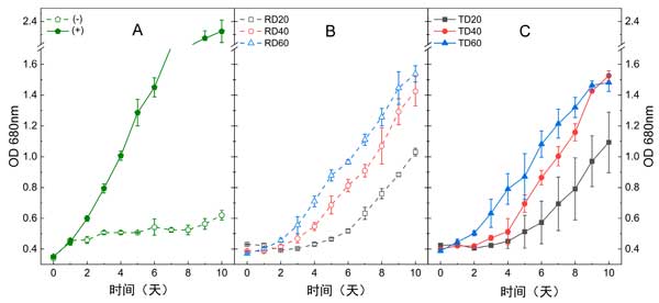 厭氧消化物中存在的大量和微量營養(yǎng)素的多樣性可能有利于藍(lán)藻代謝。即使活性炭預(yù)處理顯著降低了幾個參數(shù),包括COD、濁度和苯酚含量,原料(4405mg/L)和預(yù)處理消化物(4220mg/L)的銨濃度仍然高于藍(lán)藻螺旋藻支持的閾值濃度(100–150毫克/升)。在這種情況下,使用以三種不同稀釋率稀釋的原始和預(yù)處理消化物進(jìn)行了一系列藍(lán)藻毒性測定:20×、40×和60×。未稀釋的消化物,無論是否用活性炭處理,都沒有在本實(shí)驗(yàn)中進(jìn)行測試,因?yàn)槌醪脚囵B(yǎng)分析表明它們對培養(yǎng)物毒性太大(數(shù)據(jù)未顯示)。因此,該實(shí)驗(yàn)的目的是比較以不同稀釋率稀釋的兩種消化物以及兩個對照組之間的生長性能。連續(xù)測量680nm處的OD超過10天,以評估所有條件下的生長情況。在三種不同稀釋因子下測試的原始消化物(RD)和處理過的消化物(TD)條件下,觀察到類似生長趨勢(圖2A、B)。當(dāng)增加原始和預(yù)處理消化物的培養(yǎng)基稀釋倍數(shù)時,會產(chǎn)生更高的生長反應(yīng)。同樣,滯后期受原始消化物和預(yù)處理消化物的稀釋因子的影響,觀察到的滯后期越長,消化物越濃縮。例如,稀釋20倍和40倍的未處理消化物的滯后期分別持續(xù)4天和2天。在本研究中,根據(jù)稀釋倍數(shù)和預(yù)處理條件,使用221和71mg/L之間的初始銨氮(NH4+-N)濃度,鈍頂藻能夠增殖。一般而言,原始消化物和預(yù)處理消化物的更高稀釋度產(chǎn)生更高的生長。