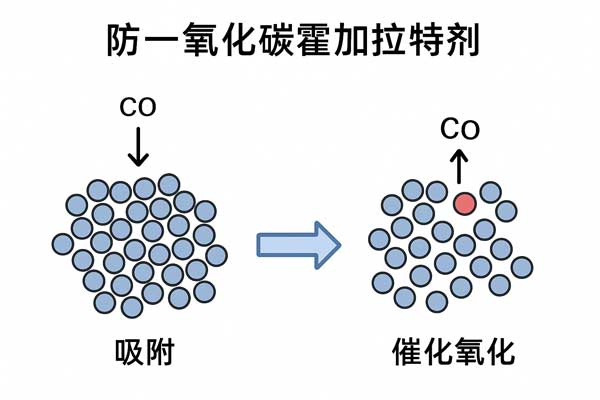 防一氧化碳霍加拉特劑的工作機制主要依靠催化反應(yīng)和表面吸附相結(jié)合: