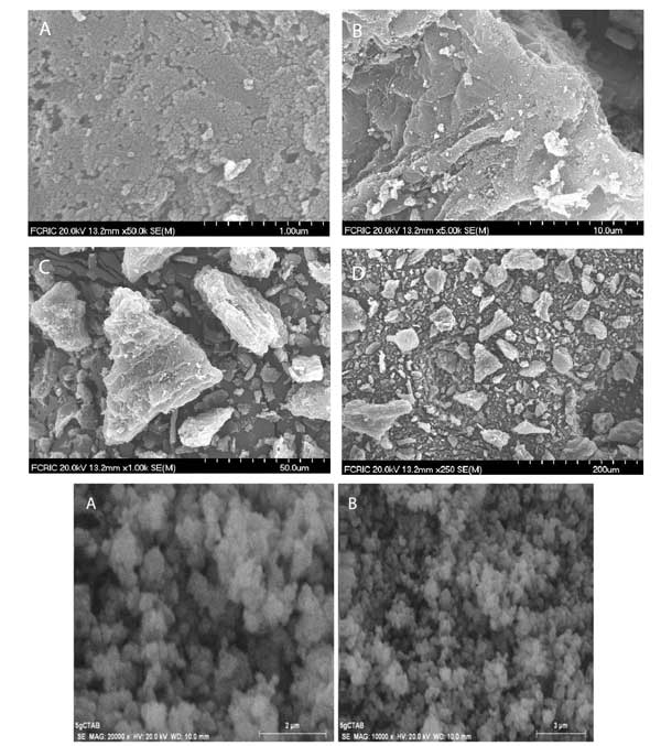 圖1呈現(xiàn)活性炭的掃描電子顯微鏡(SEM)圖像,其示出了活性炭的結(jié)構(gòu)和表面表征。圖像顯示碳顆粒的平均尺寸為約20nm,并且這些顆粒聚集在一起并形成平均尺寸為25μm的角形簇?紫堵蕿17.78%?梢钥闯龃氐谋砻媸瞧教沟模植诘暮投嗫椎。最后兩幅顯示的活性炭摻雜二氧化鈦的圖像。在嚴格攪拌下,將丁醇鈦溶液加入到含有活性炭的擬均勻溶液中,可能形成二氧化鈦,其中活性炭顆粒將其裝飾。