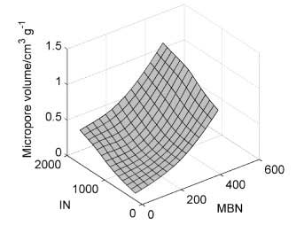 由于微孔由于其尺寸而優(yōu)先被碘分子存取,所以碘值也通過(guò)最小二乘回歸與微孔體積直接相關(guān)。然而,所獲得的誤差要高于考慮亞甲藍(lán)和碘值時(shí)的誤差。這表明亞甲藍(lán)在微孔體積預(yù)測(cè)中有一定貢獻(xiàn),可能是由于在較大微孔中的吸附。