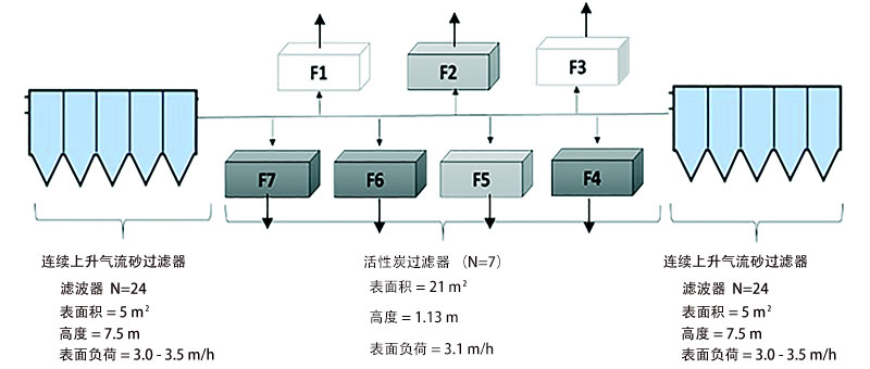 圖1:連續(xù)上流砂濾器和活性炭平行下游過(guò)濾器的示意圖。深灰色框(F4,F(xiàn)6和F7)是經(jīng)過(guò)改造的活性炭過(guò)濾系統(tǒng),淺灰色框(Rf2和Rf5)是未改造參考活性炭。存在附加過(guò)濾器(F1和F3)。