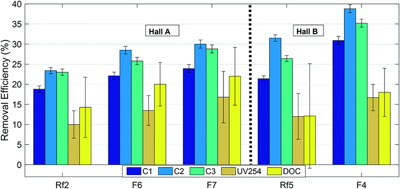 圖2:改造后的(F6,F(xiàn)7和F4)和參考(Rf2和Rf5)過(guò)濾器中活性炭對(duì)有機(jī)物級(jí)分的去除效率。誤差棒表示通過(guò)誤差傳播計(jì)算的標(biāo)準(zhǔn)誤差(N=4)。