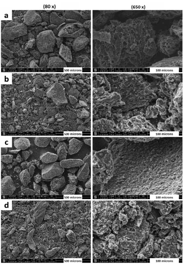 我們使用現(xiàn)代分析技術(shù)來了解制備的活性炭催化劑的真實(shí)性質(zhì),掃描電子顯微鏡(SEM)是查看材料形態(tài)的強(qiáng)大工具。圖1顯示了四種活性炭樣品的SEM圖像。圖像是在兩個(gè)不同的分辨率,以比較不同比例的樣本。評估不同煅燒溫度的影響是很重要的。圖1的左側(cè)圖像顯示,無論煅燒溫度如何,所有樣品的表面都被各種亞微米大小的顆粒所掩蓋,并且表面上存在許多明顯的解理。不同煅燒溫度下的熱解對活性炭樣品的形貌影響不大,但有輕微的變化,如一些顆粒從表面被去除,一些解理被侵蝕。此外,從這些SEM圖像可以推斷,這些活性炭材料中的許多微孔結(jié)構(gòu)使其成為任何化學(xué)反應(yīng)中反應(yīng)物相互作用的極好載體。