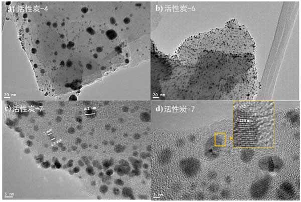 為了進(jìn)一步研究金顆粒在活性炭表面的分布和結(jié)晶度,我們拍攝了鍍金活性炭樣品的透射電子顯微鏡圖像。圖7顯示了各種活性炭樣品在不同放大倍數(shù)下的TEM圖像。圖2a、b顯示了金納米粒子在活性炭表面上的分布。很明顯,兩個(gè)樣本的分布是均勻的;钚蕴-4和活性炭-6似乎都以類似的方式相互作用和承載金納米粒子。活性炭-7樣品的高分辨率TEM圖像如圖2c、d所示。圖2c顯示大多數(shù)金納米顆粒很小,直徑為3-5nm,并且只能看到少數(shù)團(tuán)聚顆粒。圖2d顯示了金的晶格條紋間距。發(fā)現(xiàn)晶格條紋間距為0.217nm,對應(yīng)于金晶面的面。此外,我們試圖通過TEM圖像估計(jì)顆粒尺寸的分布,我們發(fā)現(xiàn)所有樣品中超過80%的金顆粒的尺寸小于5nm。