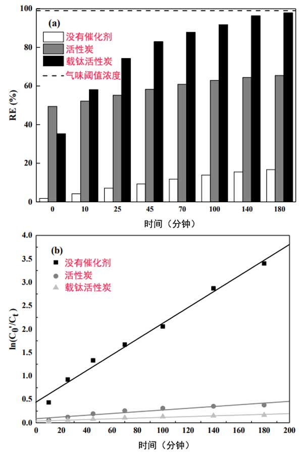 圖2:活性炭和載鈦活性炭在蒸餾水中光催化降解2-甲基異冰片的(a)去除效率和(b)動(dòng)力學(xué)。