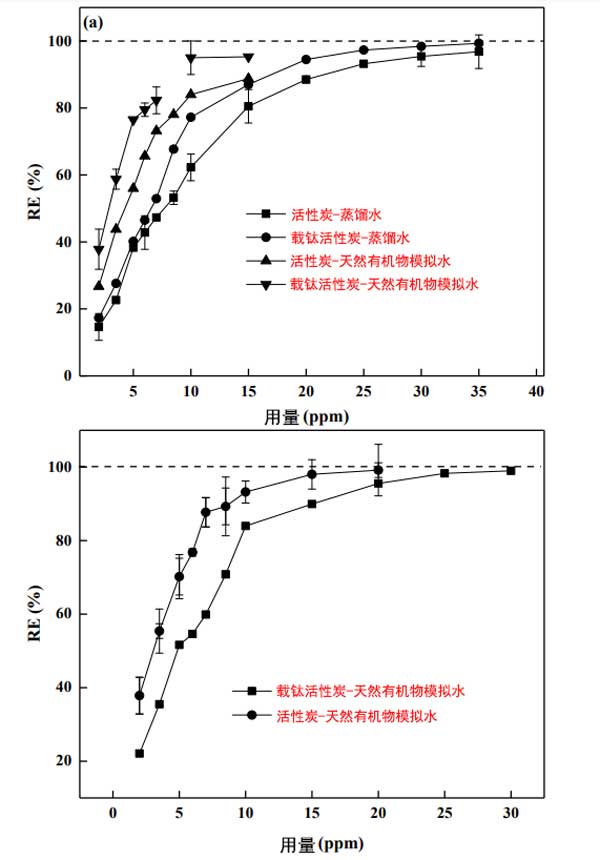 天然有機(jī)物的主要成分是腐植酸和單寧酸,因?yàn)樗鼈兤毡榇嬖谟诟鞣N天然水中。圖3顯示了從蒸餾水和天然有機(jī)物水中消除2-甲基異冰片的情況,這取決于光降解前后催化劑的用量。如圖3a所示,發(fā)現(xiàn)兩種催化劑在天然有機(jī)物水中的去除更接近。然而,腐植酸和單寧酸的存在導(dǎo)致活性炭和載鈦活性炭對(duì)2-甲基異冰片的吸附能力顯著降低。此外,為了達(dá)到氣味閾值濃度值,兩種催化劑在低天然有機(jī)物濃度的水中所需的劑量比在蒸餾水中增加了大約一倍。這種現(xiàn)象表明天然有機(jī)物和2-甲基異冰片之間對(duì)于兩種催化劑的活性位點(diǎn)存在競(jìng)爭(zhēng)關(guān)系。同時(shí),值得注意的是,當(dāng)微生物分子接近模型污染物時(shí),競(jìng)爭(zhēng)吸附最強(qiáng)。然而,在光降解后,載鈦活性炭對(duì)2-甲基異冰片的去除效率顯著提高(圖3b)。