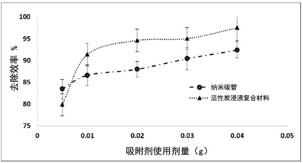 活性炭的用量是一個重要的因素,在吸附過程中起著巨大的作用。為了確定吸附劑的理想劑量,納米碳管和活性炭浸漬材料的用量從0.005到0.04g不等。圖2顯示了去除百分比(%)和不同劑量的納米碳管和活性炭浸漬材料。觀察到吸附在單位重量吸附劑上的染料量從0.005增加到0.04克。在0.04g處觀察到最大去除率,活性炭浸漬材料和納米碳管的百分比分別為97.5%和92.3%。因此,可以推斷吸附量的增加增強(qiáng)了活性紅的去除。顏色去除百分比的增加是由于隨著吸附劑材料的用量而增加,存在較大的表面積,這反過來又會增加反應(yīng)性空吸附位點(diǎn)的產(chǎn)生,使其更容易并增加離子相互作用。這些位點(diǎn)有利于活性紅溶質(zhì)轉(zhuǎn)移到吸附劑的外表面并提高其消除率。