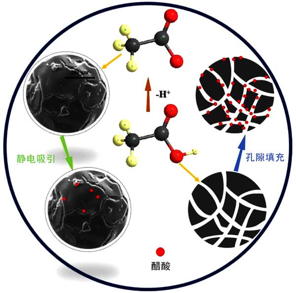活性炭對乙酸的吸附機理如圖3所示。結(jié)合上述吸附實驗和表征結(jié)果,吸附過程可能包括多個方面。首先,活性炭在足夠多的孔隙中可以發(fā)生孔隙填充效應,從而有效地吸附乙酸。其次,活性炭和乙酸之間存在靜電引力。在較高pH的溶液中,活性炭表面具有更多的負電荷,導致CH3COO-與活性炭表面之間的靜電排斥更強。