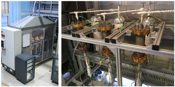 圖1:實驗室規(guī)模的甲烷化試驗臺(左),反應(yīng)器和熱交換器(右)。