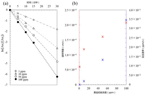 圖1:(a)初始金濃度對金離子回收率的影響,和(b)通過鋁和活性炭在銨中的電流相互作用進(jìn)行的膠合反應(yīng)的速率常數(shù)/反應(yīng)速率與初始金濃度的關(guān)系圖硫代硫酸鹽體系(注意反應(yīng)速率為負(fù)值)。