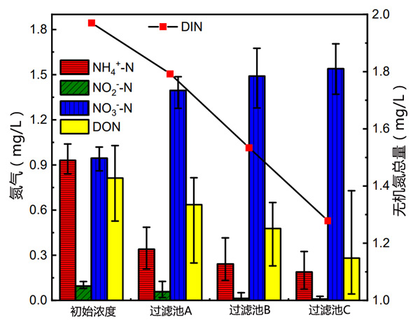 飲用原水中的氮主要以NH4+-N、NO2-N、NO3N和有機氮的形式存在。本實驗中的大部分有機氮是酪氨酸。在生物濾池中,溶解無機氮(DIN)和DON是相互轉(zhuǎn)化的,因此有必要討論活性炭濾池中向氮的轉(zhuǎn)化。進(jìn)出活性炭濾池的水中氮的變化如圖3所示。溶解無機氮損失為活性炭濾池C>B>A(p<0.05),與CODMn的去除率一致。過濾器對有機物的利用隨著溶解無機氮損失的增加而增加,表明反應(yīng)中的溶解無機氮損失現(xiàn)象與過濾器反硝化有關(guān)。