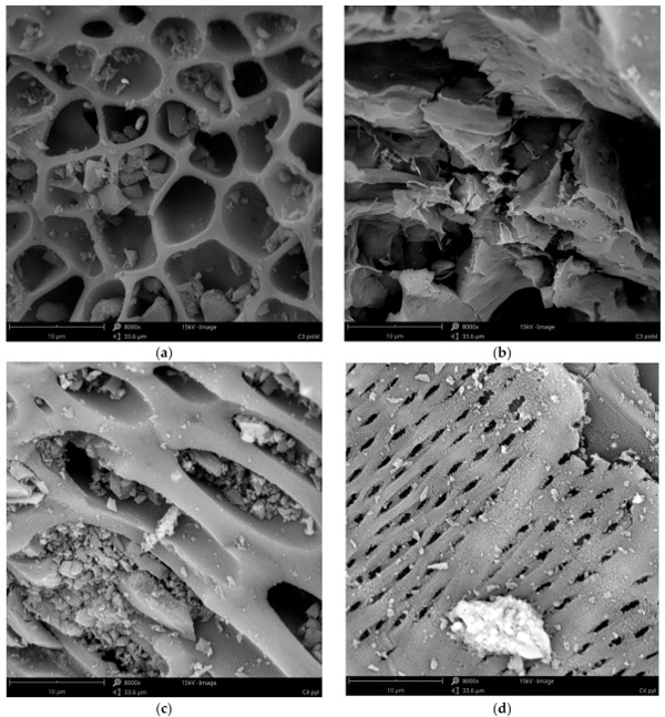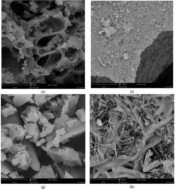 在溶劑加載之前的活性炭通過(guò)使用掃描電子顯微鏡作為SEM顯微照片進(jìn)行表征(圖1)。分析表明,不僅研究不同材質(zhì)活性炭彼此的不同,而且在一種材料中也可能出現(xiàn)不同的結(jié)構(gòu)(圖1a與圖1b、圖1c與圖1d、圖1e與圖1f和圖1g與圖1h)。所有的材料都不是均質(zhì)的,在所有的原材料中,都可以發(fā)現(xiàn)具有不同孔隙率的顆粒、壓實(shí)的塊狀,甚至是纖維結(jié)構(gòu)。材料C1(粒徑0.5÷0.75mm的活性炭)是高度多孔的,顆粒充滿可見(jiàn)孔,直徑為5÷11µm,壁光滑(圖1a),顆粒結(jié)構(gòu)的壁密度較低,但也有很大的表面積(圖1b)。粉狀活性炭(C2)具有較小的(圖1d)和較大的(圖1c)孔,具有光滑(圖1c)和較粗糙(圖1d)的壁和細(xì)長(zhǎng)的形狀。這兩種材料似乎都具有良好的孔隙率和表面,因此它們應(yīng)該是非常有效的吸附劑。我們的結(jié)果證實(shí),C1和C2在鉭的去除方面都非常有效,去除效率約為97%。C3的多孔性要小得多。雖然有一些顆粒具有相對(duì)較高的孔隙(圖1e),但也有較高含量的更致密、相當(dāng)無(wú)孔的塊狀(圖1f)。孔隙結(jié)構(gòu)受到輕微干擾,可能是由植物材料中可能存在的無(wú)機(jī)化合物晶體造成的(圖1e)。因此,這種結(jié)構(gòu)表明較低的表面和吸附特性。然而,無(wú)孔件的表面積似乎很發(fā)達(dá)(圖1f)。這是相當(dāng)虛幻的,因?yàn)樵谑褂玫乃谢钚蕴恐,材料C3的鉭去除效率最低(81%)。最小的大孔材料似乎是C4炭。它由具有緊湊結(jié)構(gòu)的塊(圖1g)和類似于納米管或纖維結(jié)構(gòu)的形式(圖1h)組成。這種材料的多孔性也比C1和C2少,但由于纖維的原因,它的表面應(yīng)該比C3更發(fā)達(dá),因此它應(yīng)該具有更好的吸附效率。事實(shí)上,這種材料的鉭去除效率略高于C3,但仍低于活性炭C1和C2。根據(jù)這些結(jié)果,可以得出結(jié)論,C1和C2的原材料就具有大孔結(jié)構(gòu)。