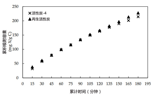 活性炭具有一定的吸附能力。隨著越來(lái)越多的成分被吸附在其表面上,吸附能力會(huì)隨著時(shí)間的推移而降低。一旦達(dá)到最大吸附容量,就不能再有效使用。對(duì)于活性炭樣品的再生,吸附的成分可以通過加熱破壞。在這部分研究中,在其表面吸附黃原酸鹽的廢活性炭樣品通過在550℃下加熱1小時(shí)進(jìn)行再生。圖2比較了初始活性炭和再生活性炭樣品的吸附性能。再生活性炭和活性炭樣品的累積吸附黃藥量相差不大。結(jié)果表明,吸附在用過的活性炭上的黃藥被破壞了,它被有效地恢復(fù)并可以重復(fù)使用。