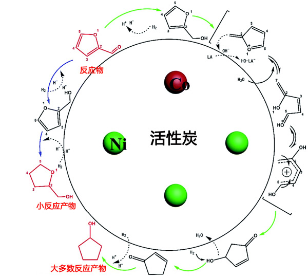 圖3:活性炭載鎳鈷催化劑上糠醛加氫的反應(yīng)過(guò)程。