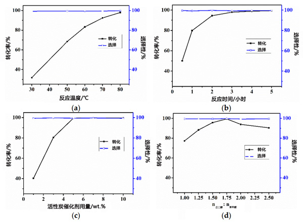 以苯甲醛與乙二醇的縮合反應(yīng)為探針反應(yīng),研究了活性炭在縮醛和縮酮合成中的催化性能。一般程序如下:10mL溶劑環(huán)己烷、25mmol苯甲醛,將43.75mmol乙二醇和0.13g活性炭催化劑在配備有溫度計(jì)和回流冷凝器的三頸燒瓶中混合,并在80℃下反應(yīng)5小時(shí)。測試了反應(yīng)溫度、反應(yīng)時(shí)間、催化劑用量和乙二醇/苯甲醛摩爾比對苯甲醛轉(zhuǎn)化率的影響。同時(shí),測試了活性炭在苯甲醛與乙二醇縮合反應(yīng)中的催化回收性能,并討論了不同基材的適用性。
