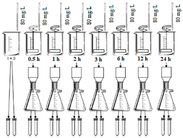 測(cè)定平衡時(shí)間的吸附試驗(yàn)對(duì)每種活性炭進(jìn)行兩次。使用了7個(gè)裝有500mL研究水的1L燒杯。每個(gè)燒杯接受一份活性炭懸浮液,以在水研究中獲得80mg/L的初始濃度。將燒杯放在一個(gè)罐子測(cè)試設(shè)備中,將混合速度保持在205rpm在恒溫23℃的環(huán)境中。采用的接觸時(shí)間為0.5、1、2、3、6、12和24小時(shí)。接觸時(shí)間后,將每個(gè)燒杯從攪拌中取出,立即通過孔徑為0.22μm的纖維素酯膜過濾研究水,以分離碳并中斷吸附過程。分析過濾后的水餾分的pH值和柱狀藻紅濃度。圖1顯示了平衡時(shí)間測(cè)定分析中評(píng)估的條件的示意圖。