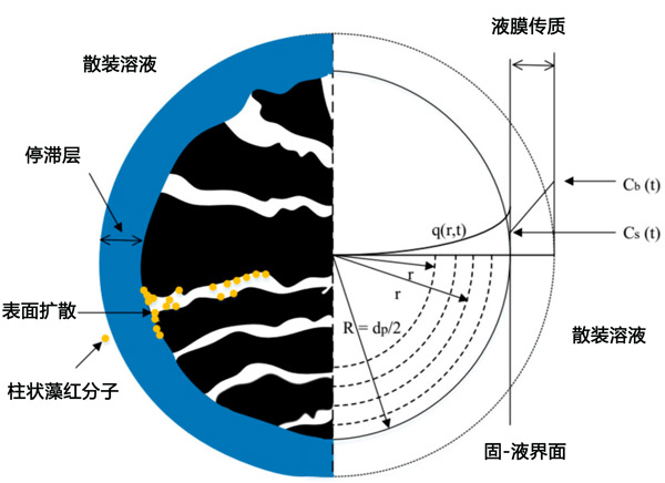 在第一實(shí)驗(yàn)階段獲得的吸附平衡測(cè)試的實(shí)驗(yàn)數(shù)據(jù)適合等溫線模型Langmuir、Freundlich和Redlich-Peterson。將最適合吸附平衡數(shù)據(jù)的等溫線模型的參數(shù)值應(yīng)用于HSDM模型,以模擬SBA柱中的吸附過程。該模型考慮了發(fā)生在兩個(gè)連續(xù)擴(kuò)散步驟中的吸附過程,即:通過活性炭顆粒周圍的固定流體層擴(kuò)散(膜擴(kuò)散)和通過活性炭內(nèi)部孔的擴(kuò)散(表面擴(kuò)散),如圖2所示。