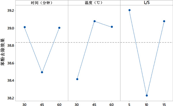 田口法用于優(yōu)化參數(shù),即時(shí)間、溫度和L/S,這些參數(shù)直接取決于苯酚的去除。選擇田口方法的選項(xiàng)越大越好。本研究的主要目的是活性炭從廢水中去除較多的苯酚,因此選擇了越大越好的選項(xiàng)。此外,采用添加劑模型來(lái)確定各個(gè)輸入?yún)?shù)對(duì)去除苯酚濃度的影響。這種分析稱為因子效應(yīng)的確定,結(jié)果見圖2。