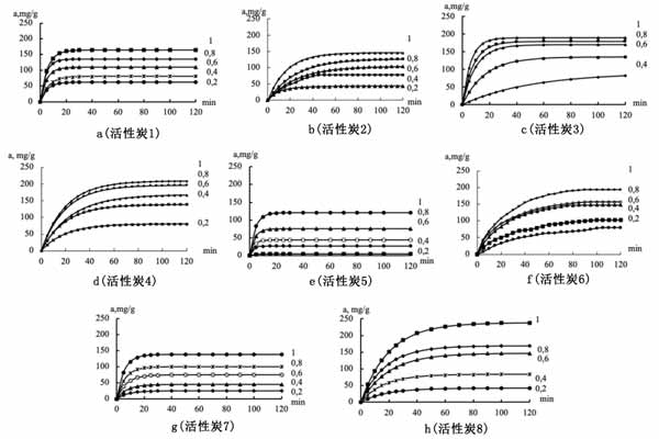 實(shí)驗(yàn)發(fā)現(xiàn)即使在成分指標(biāo)、技術(shù)特征和處理來自不同地理形成地點(diǎn)的相同類型廢物形式的原材料的條件下,活性炭吸附劑的產(chǎn)率和個(gè)體特性也很接近。根據(jù)現(xiàn)有的信息來源,它們并不總是與其最佳樣本相對應(yīng)。下述實(shí)驗(yàn)數(shù)據(jù)證實(shí)了這種情況。然而,它們具有不同的,并且在某些情況下具有高效率,可用于解決從工業(yè)排放物和排放物的有機(jī)雜質(zhì)中凈化的廣泛問題。在植物廢物(a)中獲得的活性炭從其VMA中吸附正丁醇蒸氣的動(dòng)力學(xué)曲線在圖1和圖2中進(jìn)行了比較。