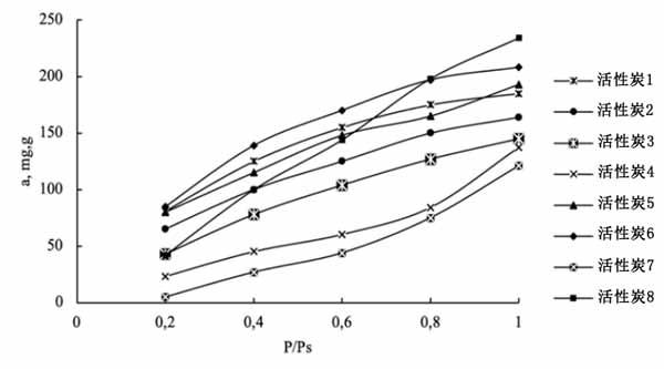 來自植物廢料的活性炭中,活性炭的K值表示吸附劑的吸收能力的最高值,活性炭2的最佳值是由于微孔體積大。表征煤與丁醇相互作用的能量的模型參數(shù)n是活性炭的最小參數(shù)。這對應(yīng)于最凸的吸附等溫線(圖2),這有利于捕獲低濃度的丁醇蒸氣。就活性炭3而言,除活性炭4外,所有活性炭均優(yōu)于活性炭5,與活性炭2相當(dāng)。根據(jù)極限飽和值,由圖1和圖2中的動(dòng)力學(xué)曲線證明。如圖1所示,繪制了相應(yīng)的吸附等溫線(圖2)。