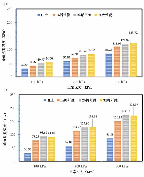活性炭試樣的剪切強度與剪切應(yīng)變的關(guān)系。峰值剪切強度隨著正應(yīng)力的增加而提高,特別是300kPa正應(yīng)力。此外,添加活性炭增加了峰值剪切強度,并且增強率隨著法向應(yīng)力的增加而增加,如圖4a所示。同樣,添加0.5%的椰殼纖維進一步提高了活性炭穩(wěn)定土的峰值剪切強度,如圖4b所示。雖然在天然紅土中添加活性炭會增加峰值強度,但對于超過2%的活性炭,增加率并不顯著。例如,活性炭穩(wěn)定土的峰值強度分別為2%和3%活性炭的121.8kPa和123.72kPa?傮w而言,與本研究的結(jié)果相似。發(fā)現(xiàn)在石灰穩(wěn)定土壤中使用椰殼纖維可進一步提高抗拉強度和抗壓強度。還觀察到,椰殼纖維的加入提高了膨脹土中的兩個剪切參數(shù)。