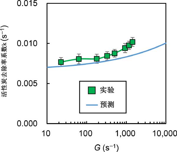 我們研究了混合強度對去除率系數(shù)(k)的影響(圖1)。我們繪制了實驗數(shù)據(jù),實線顯示了方程式預測的值。實驗結(jié)果和預測結(jié)果都表明,去除率系數(shù)隨著混合強度的增加而增加,但在G>1000s-1的范圍內(nèi),實驗結(jié)果的增加率變得更陡峭,偏離預測的速率系數(shù)值。我們假設偏差背后的急劇增加是由于活性炭顆粒在高混合強度下的分解(在給炭時輕度聚集)。這些預測是在假設活性炭顆粒的尺寸(部分聚集在原料懸浮液中)在給炭后保持不變的情況下做出的,因為原位顆粒尺寸測量是不可能的。如果這個假設是正確的,那么去除率系數(shù)隨著混合強度的急劇增加,在高G對于在給炭時已經(jīng)處于分散狀態(tài)的活性炭顆粒,不應觀察到-值范圍。為了驗證這一假設,我們使用了非聚集活性炭,其粒徑在分散處理前后沒有變化,我們在不同的混合強度。我們沒有觀察到隨著活性炭混合強度的增加,去除率系數(shù)的急劇增加,強烈表明觀察到的活性炭的急劇增加是由于高混合條件下的顆粒分解。
