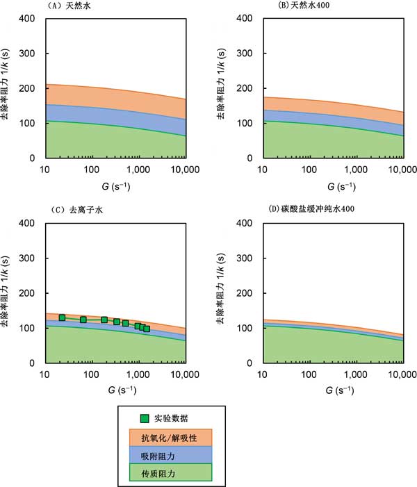 圖2:去除率阻力(1/k)分解成其成分(即,外膜傳質(zhì)、吸附和氧化/解吸的速率阻力)與活性炭混合強度(G)的關(guān)系。