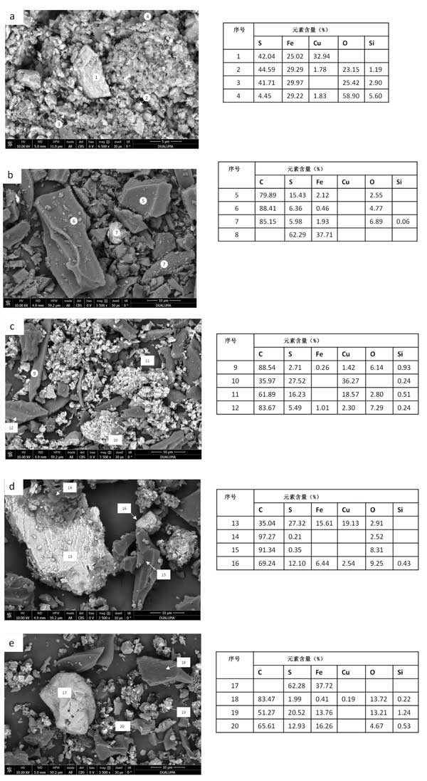 通過SEM-EDS(圖2和圖3)對添加和不添加兩種碳材料(活性炭和生物炭)以1:1和1:0.25的比例進行的礦物浸出后獲得的固體殘留物進行表征)。礦物浸出的固體殘渣中含有黃鐵礦(35%)和黃銅礦(54%)以及少量的銅藍(8%)、硫(2%)、石英(1%)和方解石(0.6%)。然而,1:1比例的礦物:活性炭的固體殘渣主要由黃鐵礦(89%)和少量石英(7.6%)和方解石(3.8%)組成。由于銅的高萃取率(99.1%),沒有觀察到銅礦物的存在。有趣的是,在比例為1:0.25的活性炭浸出系統(tǒng)的固體殘渣中觀察到高CuS含量(51.8%)和沒有黃銅礦。