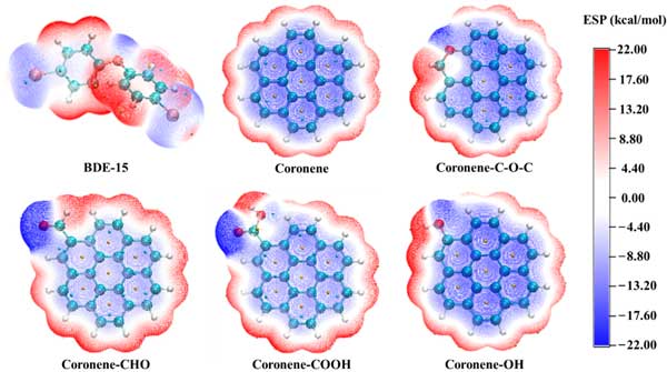 為進一步研究PBDEs與活性炭之間的微觀相互作用機制,通過計算化學(xué)研究了活性炭結(jié)構(gòu)模型與BDE-15之間的弱相互作用。根據(jù)表征結(jié)果,構(gòu)建了以暈苯為基本結(jié)構(gòu)的純碳結(jié)構(gòu)模型,以及羧基、羥基、醛和醚取代的結(jié)構(gòu)模型,模擬了活性炭的不飽和碳結(jié)構(gòu)和含氧官能團結(jié)構(gòu)。BDE-15和五種活性炭結(jié)構(gòu)模型的靜電勢如圖5所示。BDE-15在其溴原子和氧原子附近顯示出負(fù)靜電勢,而在其他區(qū)域,尤其是在其氫原子附近,則顯示出正靜電勢。這是因為溴原子和氧原子的電負(fù)性大于碳原子,而氫原子的電負(fù)性最小。在Coronene的結(jié)構(gòu)中,所有的碳原子都表現(xiàn)出負(fù)的靜電勢特征,而氫原子則表現(xiàn)出正的靜電勢特征。含氧官能團的引入增加了基團附近的正靜電勢面積和負(fù)靜電勢面積,屬于結(jié)構(gòu)中極性最強的區(qū)域。根據(jù)正負(fù)靜電勢相互吸引的原理,BDE-15和活性炭結(jié)構(gòu)模型可以形成多種復(fù)合構(gòu)型?梢酝茰y,基團附近存在強靜電勢區(qū)使得BDE-15更容易與基團結(jié)合。