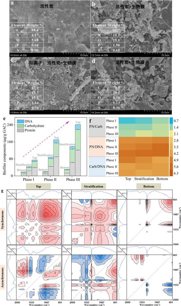活性炭是生物膜生長(zhǎng)的優(yōu)良載體,它可以快速?gòu)囊合嘀形沼袡C(jī)物和營(yíng)養(yǎng)物質(zhì),用于生物膜中微生物的新陳代謝。圖1顯示了有和沒有生物膜的活性炭形態(tài)動(dòng)力學(xué)、生物膜組分的濃度和反應(yīng)器不同位置的官能團(tuán);钚蕴恐械脑刂饕ㄌ(C,88.4%)、氮(N,4.87%)、氧(O,5.68%),以及少量的磷(P,0.04%),活性炭表面為比較順利。生物膜形成后,活性炭表面附著大量生物質(zhì),變得更加粗糙。由于生物膜中蛋白質(zhì)、碳水化合物和DNA的積累,包括N、O和P在內(nèi)的主要元素的比例顯著增加(圖1e)。值得注意的是,硫元素也被檢測(cè)到,這應(yīng)該有助于活性炭和生物膜對(duì)LAS(磺酸基團(tuán))的吸附。