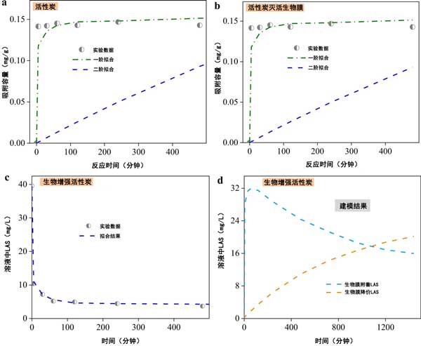 圖3:磺酸基團(tuán)去除動(dòng)力學(xué)在活性炭、b滅活生物膜-活性炭、c生物增強(qiáng)活性炭和d生物增強(qiáng)活性炭中的LAS去除動(dòng)力學(xué)的批量實(shí)驗(yàn)。