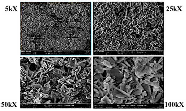 采用掃描電子顯微鏡(SEM)結(jié)合EDS分析來表征吸附劑樣品。局部化學(xué)分析通過EDS(能量色散X射線光譜法)實(shí)現(xiàn)。定性分析是通過識(shí)別光譜中報(bào)告的線來實(shí)現(xiàn)的,而定量分析(確定元素組成百分比)是通過測(cè)量樣品中存在的每種元素的線強(qiáng)度來進(jìn)行的。圖1顯示了一系列活性炭的SEM圖像,放大倍數(shù)遞增:5000、25,000、50,000、100,000倍。SEM圖像說明了活性炭的多孔結(jié)構(gòu),突出了樣品表面不連續(xù)性的存在。高孔隙率的存在對(duì)于限制鼓風(fēng)機(jī)系統(tǒng)過濾沼氣的能量損失是必要的。正如我們之前的一些研究報(bào)道的那樣,SEM圖像與EDS分析相結(jié)合可用于突出硫在孔隙和金屬基催化位點(diǎn)內(nèi)的吸附和保留。
