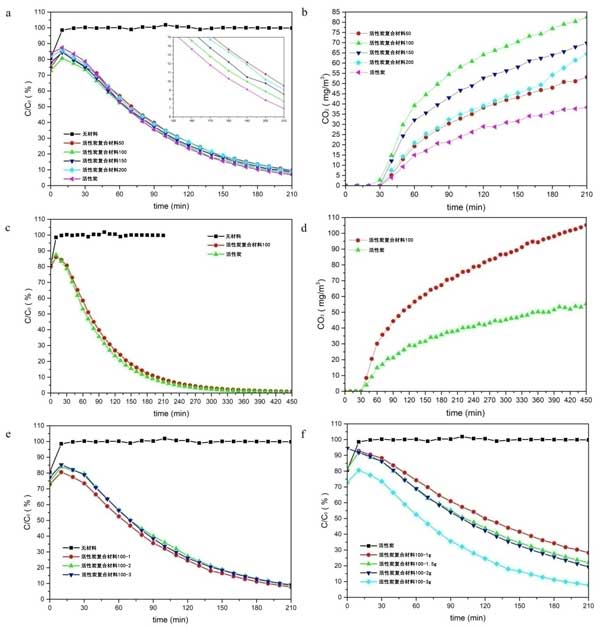 在光照下研究了活性炭復合材料在空氣中降解氣態(tài)甲苯(50.0ppm)的光催化性能。如圖3a所示,所有樣品均表現(xiàn)出超過90%的良好去除效率。在活性炭復合材料中,100g添加量的活性炭顯示出最佳效率,3小時內(nèi)去除率高達92.2%。如果用以前的方法從空氣中去除甲苯,例如生物過濾、后等離子體催化技術和電極放電。與那些通常昂貴且復雜的方法相比,目前的活性炭復合物具有綠色和低成本的優(yōu)點。使用氣相色譜儀檢測甲苯降解產(chǎn)物。結果表明,CO2是活性炭復合材料的主要產(chǎn)物(圖3b),3小時內(nèi)最高產(chǎn)率為82.5mg/m3,另一個主要產(chǎn)物應該是H2O,甲苯是碳氫化合物的基礎上。我們在介紹中提到的,活性炭主要充當吸附劑還可以作為光催化劑來降解有機污染物。然而,它僅在紫外光照射下有活性,催化效率低。這些結果清楚地表明,在活性炭表面原位生長Bi2O2CO3后,甲苯的降解率提高了。這歸因于活性炭的吸附能力和Bi2O2CO3和活性炭的光催化活性的協(xié)同效應,證明了復合材料的優(yōu)勢。