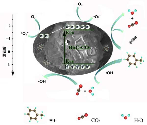 活性炭復合材料在光照射下降解氣態(tài)甲苯的光催化反應機制可以解釋如下(圖4)。首先,蜂窩狀活性炭基質(zhì)吸附并捕獲甲苯分子。然后,在光照下,電子從價帶(VB)激發(fā)到負載Bi2O2CO3的活性炭表面的導帶(CB),在VB中留下空穴。活性炭可以充當電子受體以降低電子-空穴對的復合率。因此,Bi2O2CO3中CB上的激發(fā)電子可以很容易地轉移到活性炭表面,從而促進光生電荷載流子的分離和遷移。