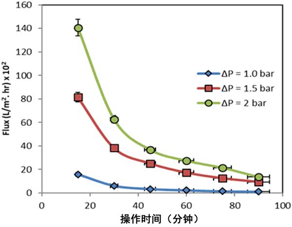 圖3顯示,在運行90分鐘后,在2bar的運行壓差下,達到的最高通量值;谶@些值,已知滲透通量值降低。發(fā)生這種情況是由于膜壁上不需要的溶解污染物顆粒堵塞,這些顆粒大于膜孔。這些顆粒堵塞膜表面的孔或卡在孔內(nèi)。這種膜壁堵塞與濃差極化現(xiàn)象密切相關(guān),在這種現(xiàn)象中,膜壁表面的污染物濃度較高,導(dǎo)致較低的流體流量,而通過膜的污染物最少。也可以在圖3中看到滲透通量隨著較高的操作壓力而增加,這對應(yīng)于膜操作的驅(qū)動力。施加到流過膜的進料流的壓力將導(dǎo)致與膜孔相比顆粒尺寸更小的流體流可以通過膜,而較大的顆粒,例如污染物,將被保留。Fe、Mn、Zn、NH3–N、PO4各污染物從初始濃度1.38、1.30、0.92、0.90、0.93mg/L的總截留率分析結(jié)果分別為92.03、97.08、99.67、84.56、87.10%。這些分析結(jié)果顯示了這項工作的可喜成果,其中每項總拒絕率都在80%以上。