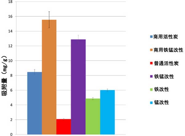 為了比較各種活性炭吸附砷(V)的效果,將0.1克活性炭添加到50mL/50ppm砷(V)樣品中。將樣品以150rpm攪拌6小時(shí),然后過濾,然后對(duì)濾液進(jìn)行元素分析。為了比較不同活性炭基質(zhì)的功效,以每克活性炭吸附的砷(V)毫克數(shù)(mg/g)來比較相對(duì)于添加的活性炭量的吸附。如圖所示數(shù)字圖1,與鐵、錳和鐵/錳一起官能化后,砷的吸附有顯著改善。