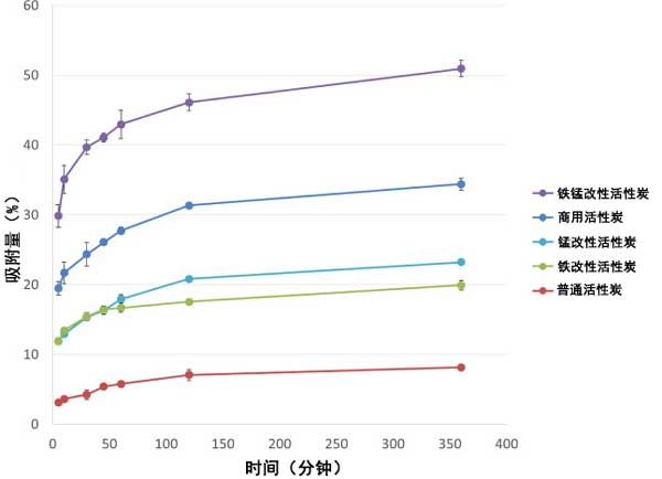 復(fù)合鐵錳活性炭顯示出最高的吸附容量,6小時(shí)后的吸附量達(dá)到總吸附量的50.93±1.17%。這表明比標(biāo)準(zhǔn)活性炭和單金屬負(fù)載活性炭都有顯著改進(jìn)。鐵錳負(fù)載活性炭的二元系統(tǒng)協(xié)同工作,在吸附過程中利用了上述所有吸附機(jī)制,使得吸附容量比單金屬負(fù)載活性炭材料增加更多。