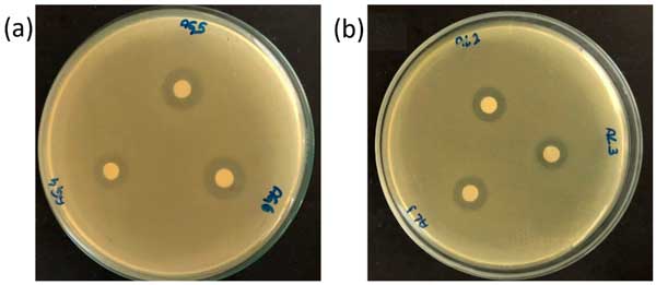 圖2:通過紙片擴(kuò)散對(duì)(a)水基大蒜提取物,16±1.3mm和(b)乙醇基大蒜提取物,14±1.0mm進(jìn)行抗菌敏感性測(cè)試(從10次重復(fù)獲得的平均值和標(biāo)準(zhǔn)偏差值)。