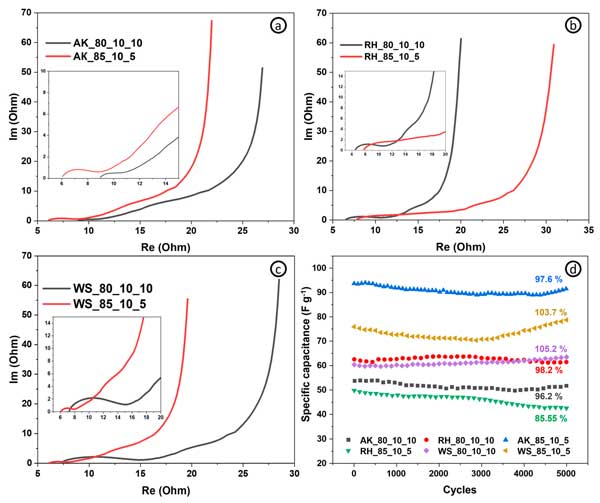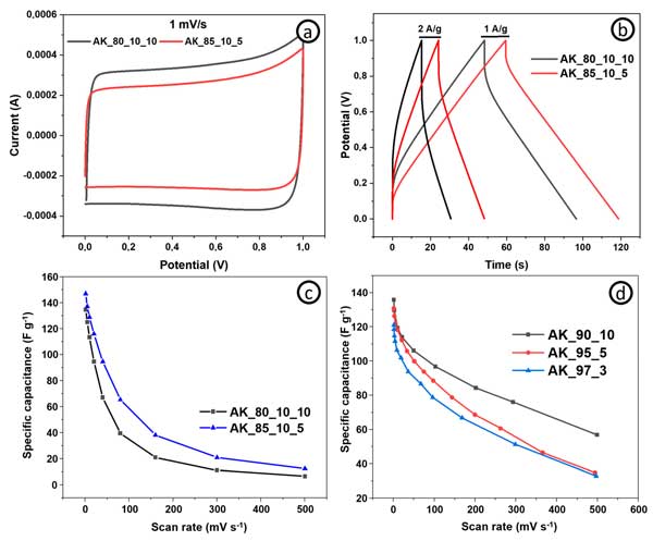 活性炭電極表現(xiàn)出比常規(guī)樣品更好的比電容和能量密度(相同功率密度下的最大能量密度為4.8vs.4.4Wh/kg-1),因?yàn)橛懈嗟幕钚圆牧希娮、倍率能?圖3c)和功率密度—這取決于電極的導(dǎo)電能力(基于導(dǎo)電添加劑含量)。圖3d顯示了具有不同活性炭和碳納米管含量的電極在不同掃描速率下的比電容。碳納米管含量為10%的電極在1mV/s-1下實(shí)現(xiàn)了137F/g-1的最高比電容。從圖中可以清楚地看出,就比電容而言,活性炭和碳納米管的最佳比例為90:10。綜上所述,我們可以得出這樣的結(jié)論:對于超級電容器的自支撐電極,活性成分、結(jié)合成分和導(dǎo)電成分的最佳比例為85:10:5?梢赃M(jìn)一步評估具有這種含有源自其他生物前體的活性材料的組合物的電極的電化學(xué)性能。