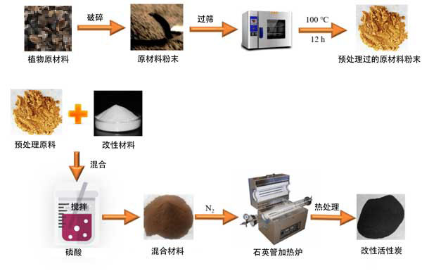 改性活性炭的合成在圖1顯示。將5.0g的原材料粉末與不同量的Na2EDTA(0、10、15和20mmol)混合,然后在磷酸中浸泡一段時(shí)間。將樣品加熱到一定溫度(分別為500℃、600℃和700℃)。升溫速率為5℃/分鐘。當(dāng)溫度達(dá)到目標(biāo)值時(shí),將樣品在N2中保持1小時(shí),然后冷卻至室溫。隨后,用去離子水沖洗樣品,直至達(dá)到穩(wěn)定的pH值,然后在90℃的真空烘箱中干燥過夜,最后細(xì)磨成小于100目的顆粒。此過程得到Na2EDTA改性的活性炭。