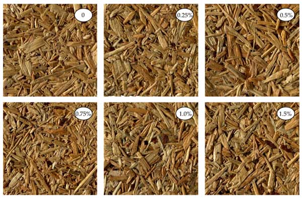在UF樹脂中添加活性炭還可以改善刨花板的各種機(jī)械性能。研究表明,活性炭可以提高板材的尺寸穩(wěn)定性、強(qiáng)度和防水性。這在擔(dān)心潮濕暴露的應(yīng)用中尤其有益。所生產(chǎn)的刨花板的外觀如圖2所示。添加高達(dá)1.5%活性炭沒有觀察到任何影響。相反,在碳含量較高的情況下,所得板材變暗并變灰。因此,在不影響材料美觀的情況下,這可以被視為較小負(fù)載的優(yōu)勢。