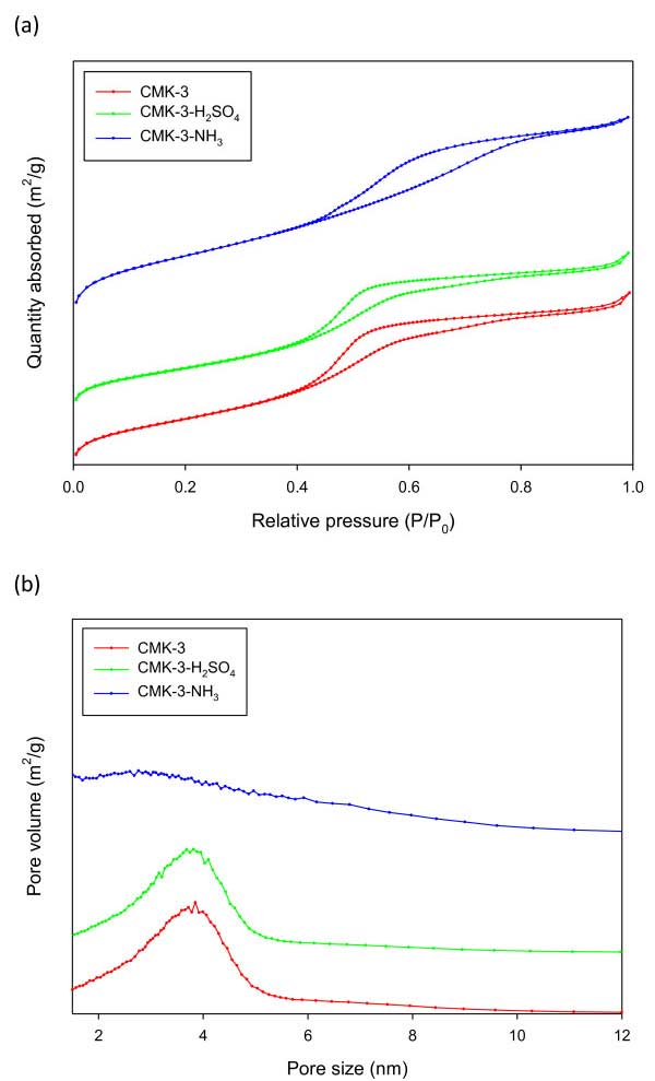 表1列出了本研究中使用的活性炭的物理性質(zhì);钚蕴-3的比表面積為1178m 2 / g。經(jīng)硫酸處理后比表面積略有下降至1,002m 2 / g,經(jīng)氨處理后比表面積大幅度上升至1663m 2 / g。圖2示出了氮氣吸附等溫線和孔碳的孔隙大小分布。圖2a示出了用于活性炭-3,活性炭-3-H的氮吸附等溫線2 SO 4,和活性炭-3-NH 3。所有樣品在0.5 的相對壓力(P / P 0)下都顯示典型的介孔材料的IV型等溫線。表表11表明,CMK-3具有的3.8納米的孔徑中孔。用硫酸處理后維持這些中孔。當(dāng)活性炭-3用氨處理時,平均孔徑減小到3.1nm。氨處理是高溫(900℃)工藝,其產(chǎn)生微孔,引起表面積的大量增加和平均孔徑的減小。另一方面,大部分介孔活性炭-3在氨處理后保持。