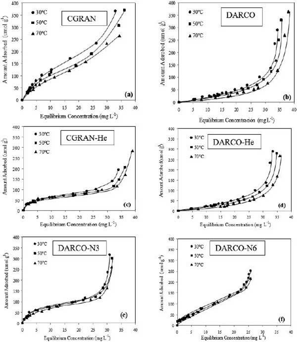 評估原樣處理的活性炭對松香酸的吸附情況,結(jié)果如圖1所示。該圖描繪了在處理前和后處理的CGRAN和DARCO活性炭的三種溫度(30,50和70℃)下作為平衡濃度函數(shù)的吸附容量。從先前對吸附速率的研究(此處未顯示),確定在30分鐘達(dá)到吸附平衡。根據(jù)分類等溫線,CGRAN和CGRAN-He(圖1a和1c)顯示了“L”型等溫線,這是樅酸和吸附位點(diǎn)之間強(qiáng)親和力的特征。DARCO(圖1b)和DARCO-He(圖1d)活性炭表現(xiàn)出“S”型等溫線,歸因于溶質(zhì)和溶劑之間競爭吸附的結(jié)果,松香酸對吸附位點(diǎn)的親和力較低。圖1e和1f所示的HNO3氧化樣品(DARCO-N3和DARCO-N6)的 等溫線為“L”型吸附等溫線,樅酸和溶劑之間具有強(qiáng)親和力的特征。26,27另外,DARCO-N3展示了一個(gè)被歸類為“L2”的等溫線,其中平臺指示表面上的所有可用位點(diǎn)均分布在單層中,并且DARCO-N6根據(jù)“L1”子群顯示等溫線,其中沒有觀察到高原,表明未覆蓋單層。 這種行為與DARCO-N6顯示的更多的表面功能組一致。