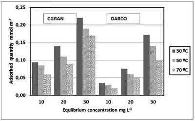 為了確定表面氧基團(tuán)的具體影響,通過S BET將吸附容量標(biāo)準(zhǔn)化。如圖2所示,CGRAN活性炭具有比DARCO活性炭更高的松香酸吸附容量。在測試的三個(gè)溫度下觀察到CGRAN的更大的吸附容量。根據(jù)平衡濃度CGRAN的平均吸附能力高2-3倍。然而,由于更大的吸附潛力,這種差異在較高的平衡濃度值下降。表面積歸一化吸附量表明,氧官能團(tuán)的存在對活性炭的吸附能力起著重要的作用。CGRAN的較高的吸附能力可通過的強(qiáng)酸位的存在來解釋(作為較高量的官能團(tuán)的結(jié)果),有利于松香酸的吸附高達(dá)30毫克的L -1。對于DARCO活性炭來說,情況正好相反。