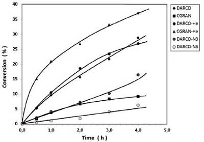 活性炭催化劑的活性在樅酸隨時(shí)間的變化中進(jìn)行測試,如圖3所示。該圖顯示DARCO催化劑顯示比CGRAN催化劑更高的轉(zhuǎn)化率。圖3還比較了接受活化的碳催化劑與He處理的對應(yīng)物的轉(zhuǎn)化率:CGRAN-He顯示出比CGRAN催化劑顯著更高的轉(zhuǎn)化率,這是與從TPD,F(xiàn)TIR和酸度結(jié)果推斷的表面氧基團(tuán)數(shù)目較少有關(guān)的行為。DARCO和DARCO-He之間的轉(zhuǎn)化沒有明顯的差異,這與兩種催化劑中表面氧基團(tuán)的量相似。沿同一線,比較DARCO和相應(yīng)的硝酸氧化樣品的活性,如圖3所示。數(shù)據(jù)清楚地顯示了轉(zhuǎn)化率與HNO 3濃度之間的反比關(guān)系用于改性處理。因?yàn)樵谔幚碇鬀]有明顯的變化,所以質(zhì)地特性的影響可以打折扣; 因此,這種行為顯然是酸強(qiáng)度和表面含氧基團(tuán)的效應(yīng),從TPD,F(xiàn)TIR和總酸度結(jié)果得出的DARCO活性炭表面的化學(xué)修飾的證明。DARCO-N6催化劑的最低轉(zhuǎn)化率可以與它們的最高酸強(qiáng)度相關(guān),而DARCO表現(xiàn)出的最高轉(zhuǎn)化率是由于它們的最低酸強(qiáng)度。這些結(jié)果表明,盡管強(qiáng)酸性位點(diǎn)有利于樅酸的吸附,但是它們會削弱催化活性。這些發(fā)現(xiàn)也表明這些位點(diǎn)對于催化裂化沒有活性。
