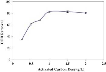 氧化處理后產(chǎn)生的污水仍然含有相當(dāng)數(shù)量的有機(jī)物,如COD殘留值(470 mg / L)。因此,采用后處理方法,通過(guò)使用活性炭,從處理后的廢水流出物中除去殘留的有機(jī)物質(zhì)。活性炭從處理過(guò)的流出物中吸附有機(jī)化合物可能是由于溶質(zhì)的疏水性。
