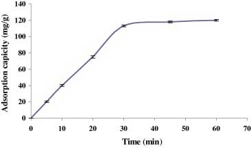 活性炭對(duì)廢水中有機(jī)物的吸附不僅受活性炭劑量的影響,還受到吸附劑在反應(yīng)混合物中的保留時(shí)間的影響。為了確定活性炭吸附過(guò)程的最佳保留時(shí)間,在最佳吸附劑(0.75 g / L)和幾個(gè)處理過(guò)的廢水樣品上進(jìn)行了實(shí)驗(yàn)。分析殘余的COD。所獲得的數(shù)據(jù)顯示在圖3中顯示了吸附能力(q)隨時(shí)間的變化。吸附能力隨著時(shí)間的推移而增加,并且COD水平隨著時(shí)間而降低。30 min 后COD的去除率為77%,q達(dá)到113 mg COD / g。因此,最佳保留時(shí)間選擇為30 分鐘。