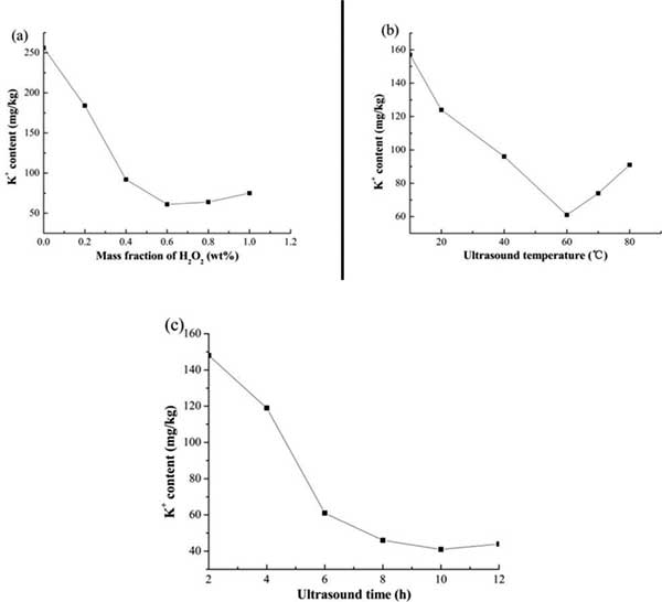 然后對(duì)活性炭(AC-WH 1%/ 120min)進(jìn)行氧化 - 超聲處理以深度除去鉀離子。研究了H2O2溶液的質(zhì)量分?jǐn)?shù),超聲溫度和超聲時(shí)間對(duì)活性炭中鉀離子含量的影響。得到的結(jié)果和圖2所示。H2O2溶液的質(zhì)量分?jǐn)?shù)在超聲時(shí)間6小時(shí)和超聲溫度60℃下在0-1.0重量%的范圍內(nèi)。表明不含H2O2的活性炭的鉀離子含量處理量為256 mg / kg,大大低于活性炭(AC-WH 1%/ 120min)和417 mg / kg,這與超聲波作用能夠加速固體間的液體傳質(zhì)過程,促使交流孔內(nèi)的一些非碳化物質(zhì)與鉀離子一起分散到溶液中。從圖2(a)可以看出,活性炭的鉀離子含量從256顯著降低到61 mg / kg,此后當(dāng)H2O2溶液的質(zhì)量分?jǐn)?shù)從0增加到0.6 wt%時(shí),基本保持不變。。因此,可以說H2O2處理對(duì)生產(chǎn)低鉀離子含量的活性炭有很大的影響。一方面,作為氧化劑,H2O2溶液可以減小鉀離子和活性炭孔壁之間的作用力,使其容易轉(zhuǎn)移到溶液中。另一方面,活性炭中的鉀離子可以與一些有機(jī)基團(tuán)以化學(xué)鍵的形式共存,這些有機(jī)基團(tuán)可以通過H2O2溶液的存在而被破壞,使得可以有效的去除活性炭中的鉀離子。